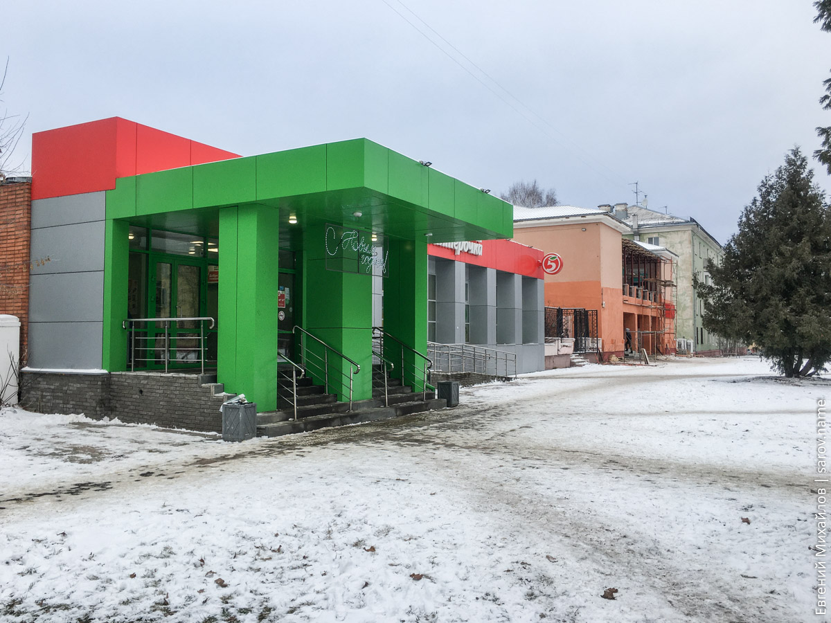 Разумеется, открытие такого магазина значит, что не самое плохое советское здание «украшено» поперёк здоровенной красной полосой и крупным белым названием.